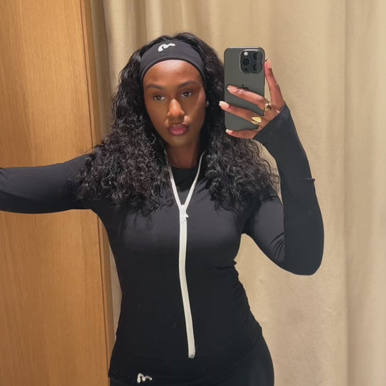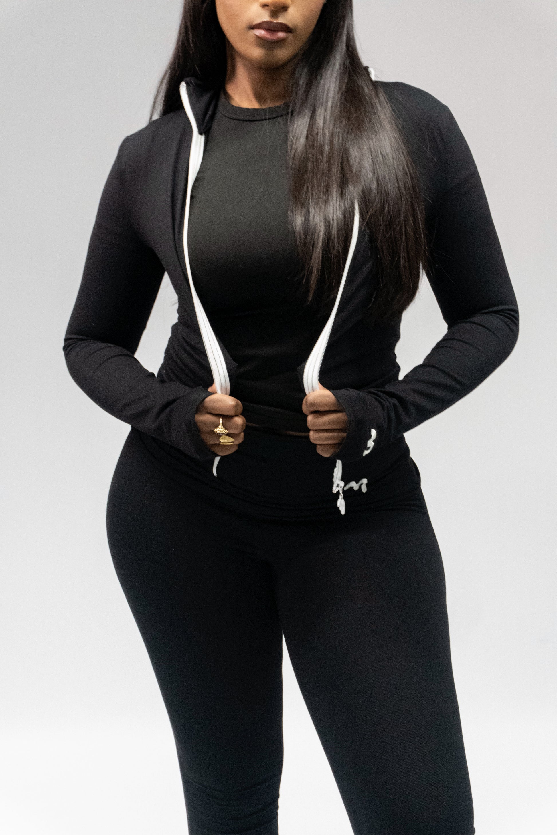 The Classic Black Zip-Up Jacket is designed for the perfect, figure-hugging fit. Complete the outfit with the matching Classic Black Fold-Over Leggings for the perfect combo.